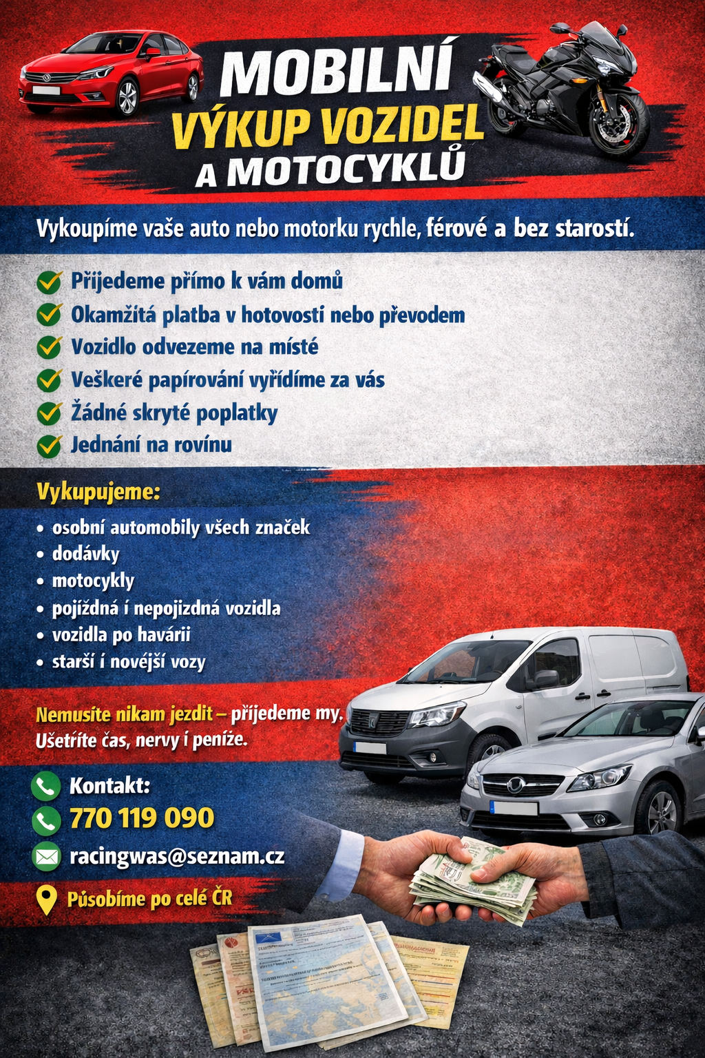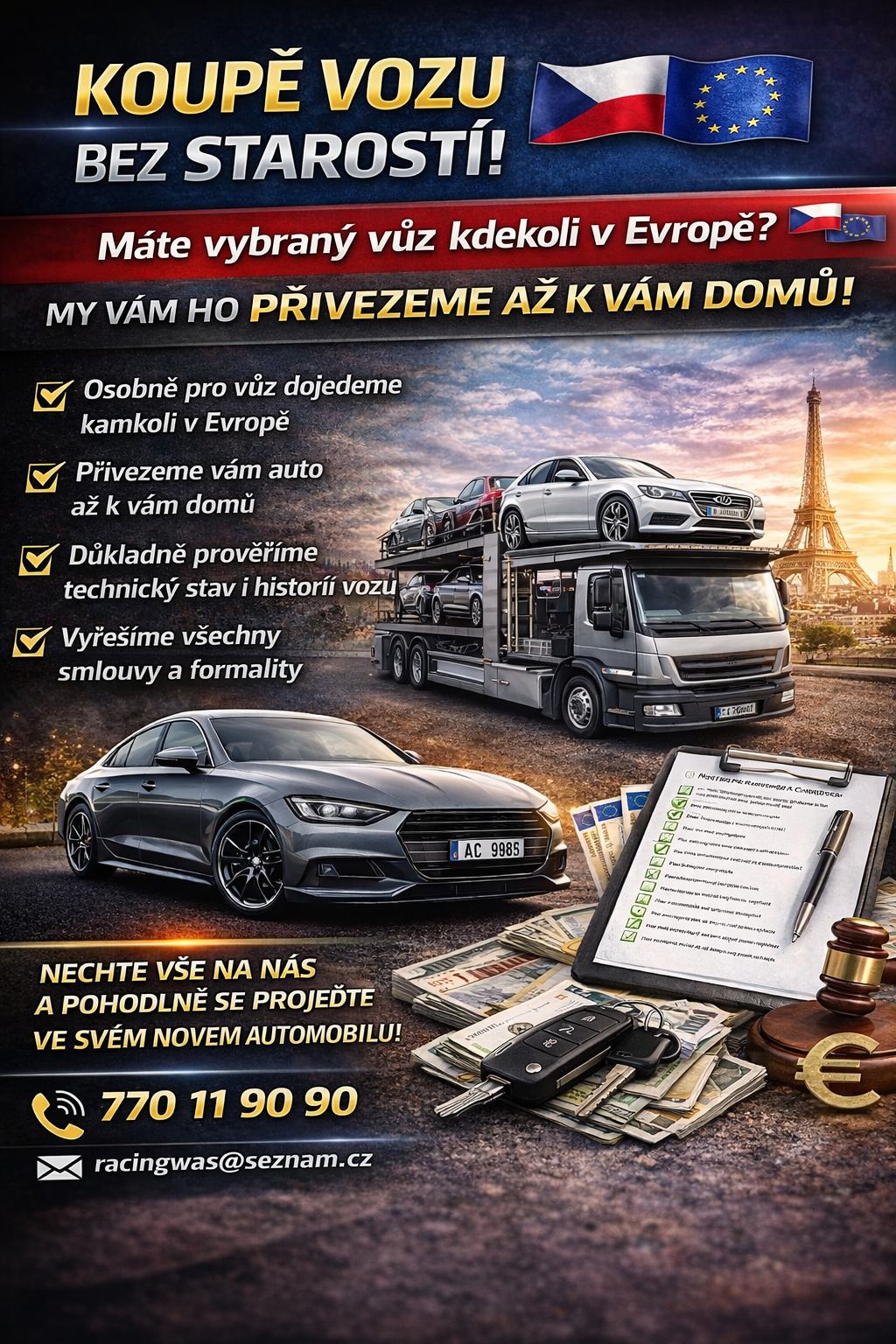 Kromě odtahové a asistenční služby se věnujeme také přepravě vozidel a dovozu automobilů ze zahraničí, mobilní výkup vozidel a motocyklů.